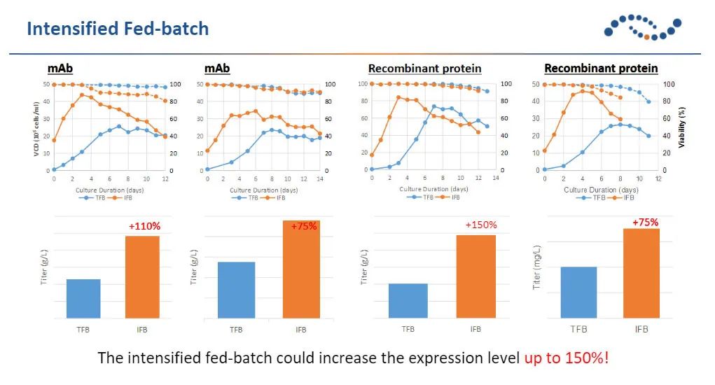 透过强化型的补料批培养,并结合细胞生长特性, 生长代谢的监控, 可以在与传统的工艺方式相同的培养周期, 提高蛋白质表达量超过70%。