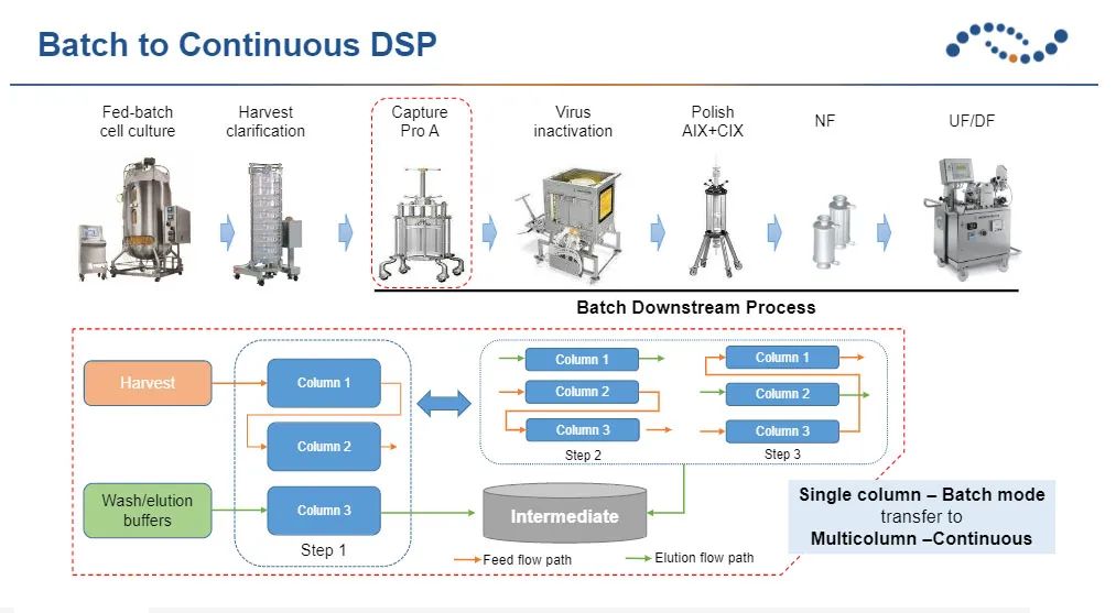 因应细胞培养表达量大幅提升后而对下游纯化所带来的压力, 汉腾生物以亲和多柱层析的先进技术来提高填料使用效率。由于单柱亲和柱会有样品流穿的问题, 因此填料的使用效率往往都只有40%以下, 而多柱联用可把填料的使用效率提升至90%以上, 进而显著的降低填料使用量。与传统的批次纯化方式相比, 多柱连续层析技术可让填料使用量减少高达80%。